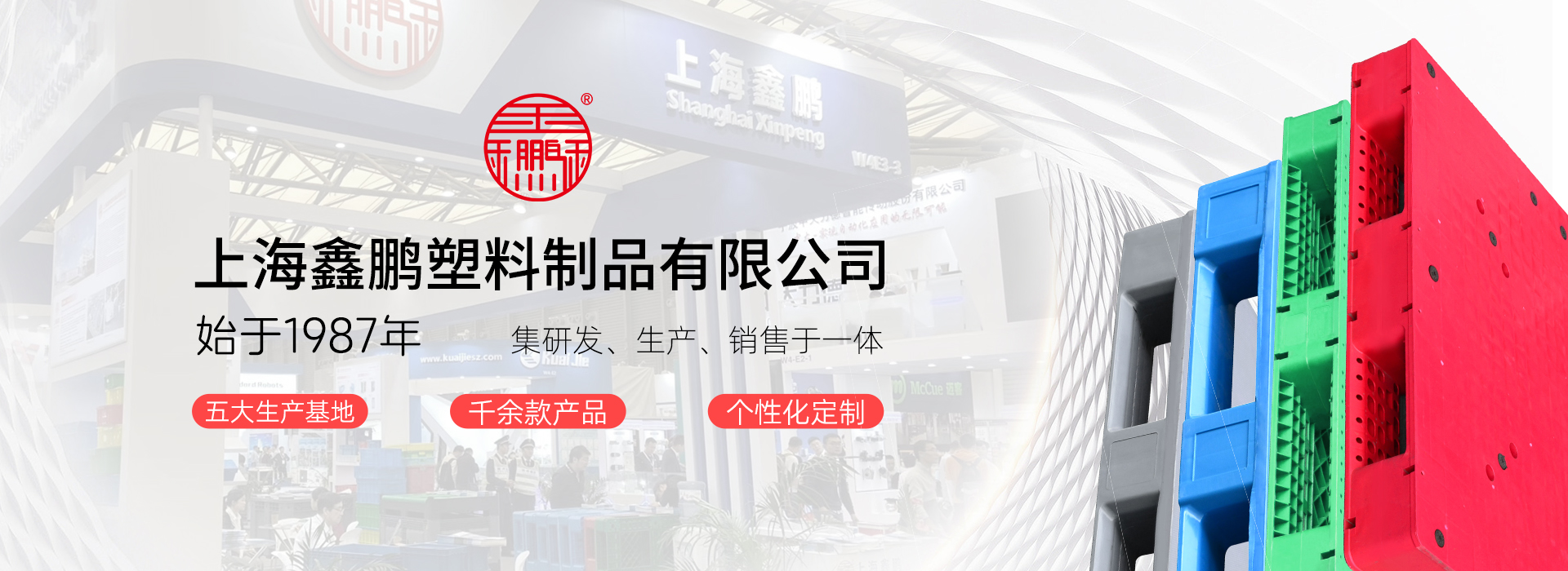 上海鑫鵬塑料創始于1987年,始終專注深根塑料產業鏈,業務板塊包括:塑料原料貿易、塑料制品研發制造(塑料托盤、塑料箱筐、卡板箱、環衛桶等)。現全國有5個生產基地:上海2個、四川1個、江蘇2個。